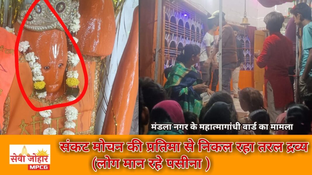 हम बात कर रहे है मप्र के मंडला नगर के महात्मा गांधी वार्ड की जहाँ चूरामन घाट जाने वाले मार्ग पर स्थित हनुमानजी का पुराना मंदिर है। इस मंदिर में हनुमानजी प्रतिमा स्थापित है जिसमे बीते दिनों से पसीना पानी की तरह बहने की अफवाहें फैली लोगो को जब बातें भरोसे लायक समझ नही आई तो वे लोग देखने हनुमान मंदिर पहुँचने लगे जो अब कौतूहल का विषय बना हुआ है और हनुमान जी की प्रतिमा की फ़ोटो व वीडियो सोशल मीडिया में जमकर वाइरल हो रही है। फ़ोटो में साफ तौर पर दिखाई दे रहा है कि प्रतिमा से पानी की बूंदे चेहरे पर दिखाई दे रही है और जो चोला हनुमानजी को चढ़ाया गया था वह भी भींग रहा है।
