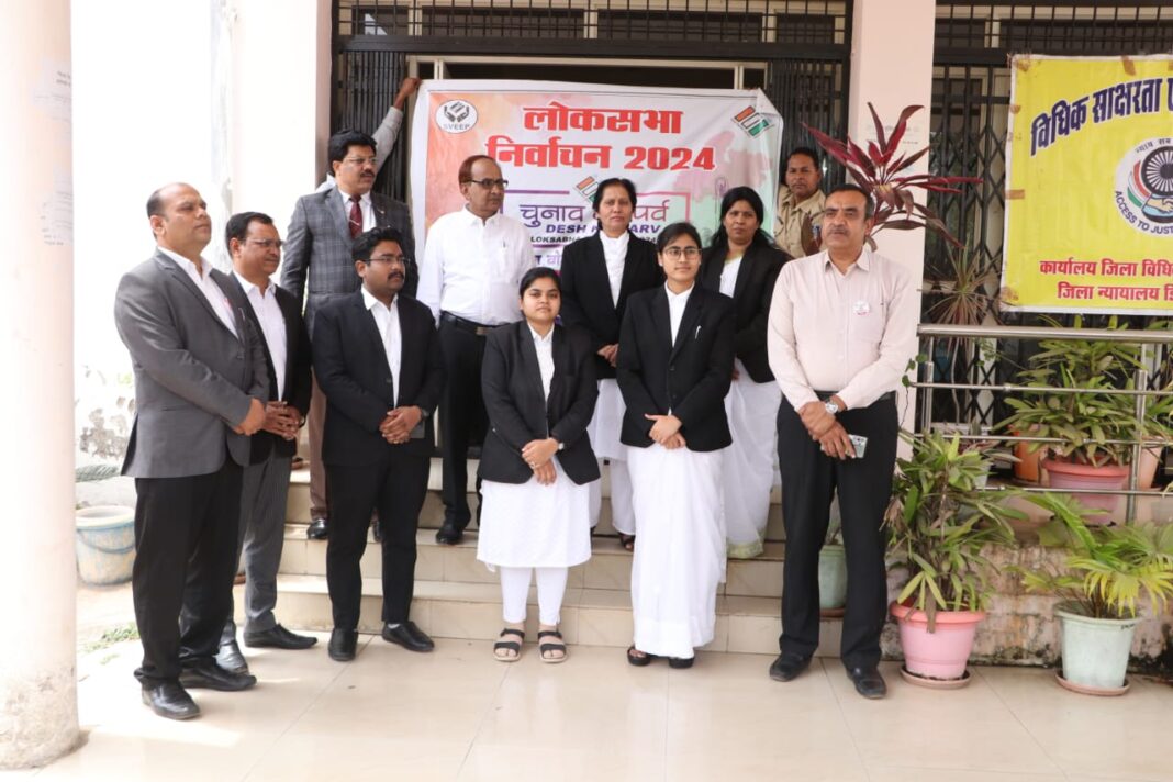 सेवाजोहार (डिंडौरी) : कलेक्टर विकास मिश्रा के निर्देशन में स्वीप गतिविधि के तहत जिला न्यायालय में परिवार को मतदान शपथ दिलायी गयी। जिला न्यायाधीश नीना आशापुरे की उपस्थिति में कलेक्टर एवं जिला निर्वाचन अधिकारी विकास मिश्रा ने 19 अप्रैल को मतदान करने के लिए शपथ दिलाई। कलेक्टर विकास मिश्रा ने सभी विधिक परिवार से मतदान करने के लिए अपील करते हुए कहा कि आप सभी मतदान के लिए अवश्य जाएं, और अपने साथियों को भी मतदान के लिए प्रेरित करें। मतदाता पर्ची का वितरण किया जा रहा है। जिससे मतदान केन्द्रों की जानकारी प्राप्त हो सकेगी।