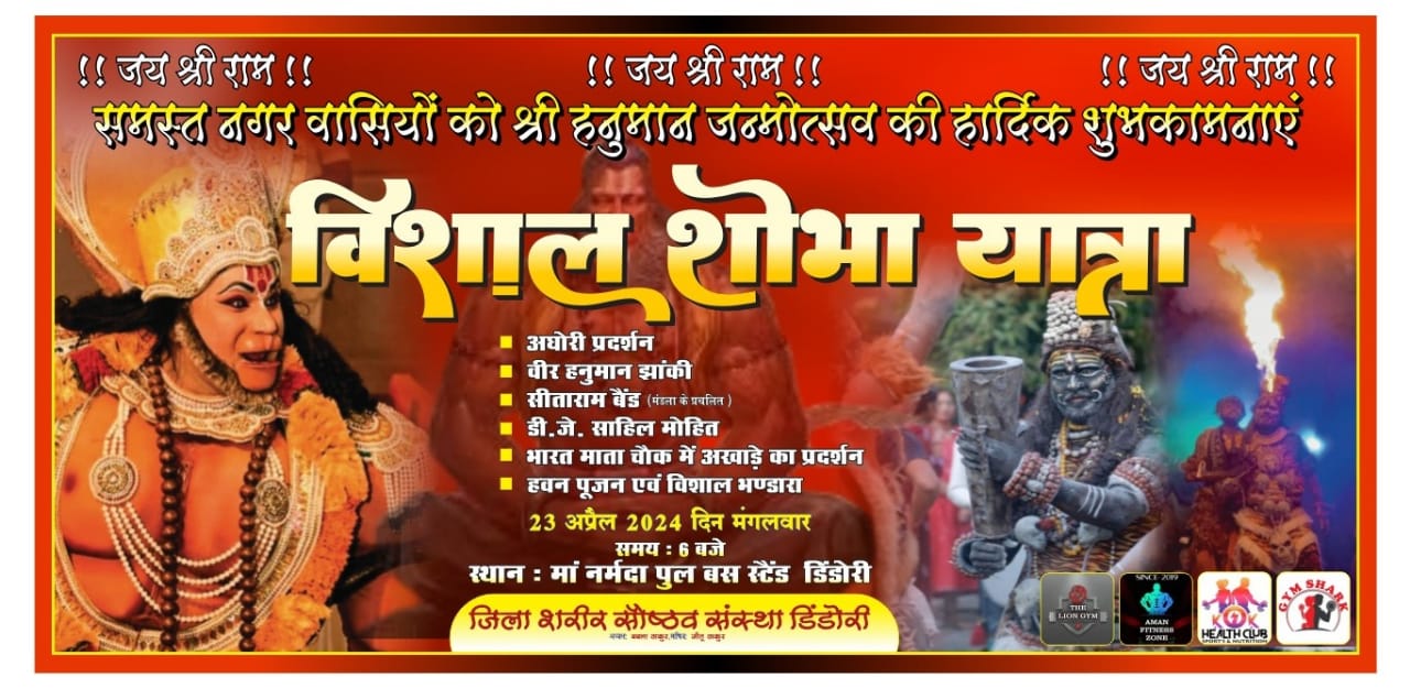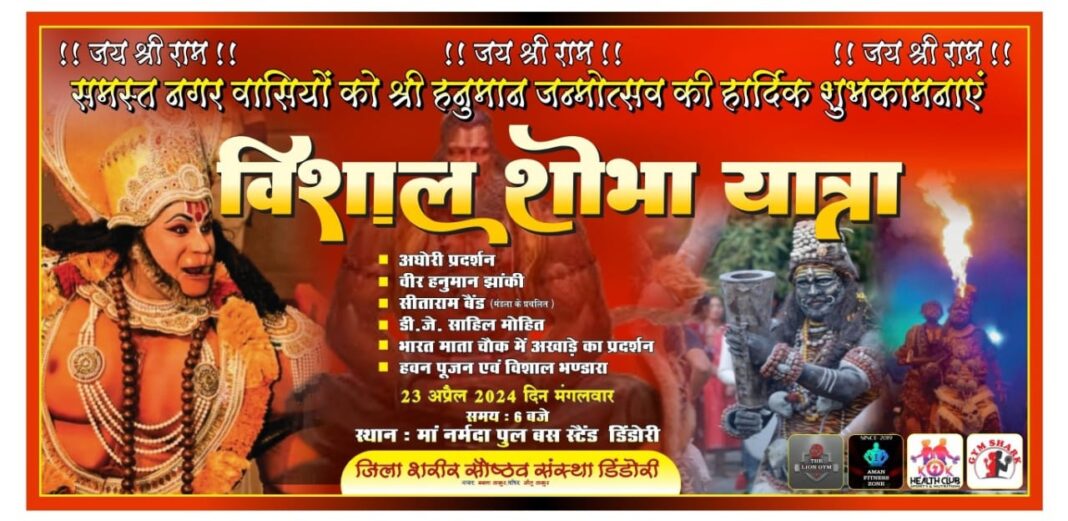 सेवाजोहार (डिंडोरी): जिला बॉडीबिल्डिंग संघ के अध्यक्ष बबला ठाकुर ने बताया कि प्रतिवर्ष अनुसार इस वर्ष भी श्री हनुमान जन्मोत्सव के पावन अवसर पर कार्यक्रम का आयोजन किया जा रहा है उक्त कार्यक्रम में सुबह नर्मदा पुल स्थित हनुमान मंदिर मे पूजा पाठ व भंडारा किया जायेगा जिसके पश्चात् शाम 6 बजे हनुमान जी की विशाल शोभायत्रा निकाली जाएगी इस शोभायात्रा मे तरह तरह की हनुमान जी व उज्जैन से अघोरियो की आकर्षक झाकिया भी रहेंगी साथ ही भारत माता चौंक मे अघोरियो व अखाड़े का प्रदर्शन भी किया जायेगा