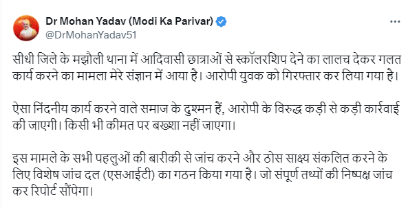 याद रखिए ‘मिस्टर करप्शननाथ’ कि यह भाजपा की मोहन सरकार है जहां महिलाओं के साथ होने वाले हर अपराध को सख्ती कुचला भी जाता है और उनके हौसलों को ध्वस्त किया जाता है।