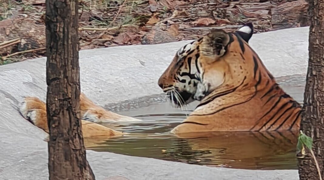 सेवाजोहार (मंडला): विश्व प्रसिद्ध कान्हा राष्ट्रीय उद्यान में पर्यटकों को चेहरे उस समय खिल उठे जब जोरदार गर्मी से निजात पाने के लिए बाघिन सुंदरी स्विमिंग पूल में उतर पड़ी। बाघिन सुंदरी ने अपने शरीर की गर्मी को पानी के भीतर न सिर्फ शांत किया बल्कि पर्यटकों को शानदार पोज भी देती दिखाई दी। जिससे पर्यटकों की खुशी का ठिकाना न रहा।