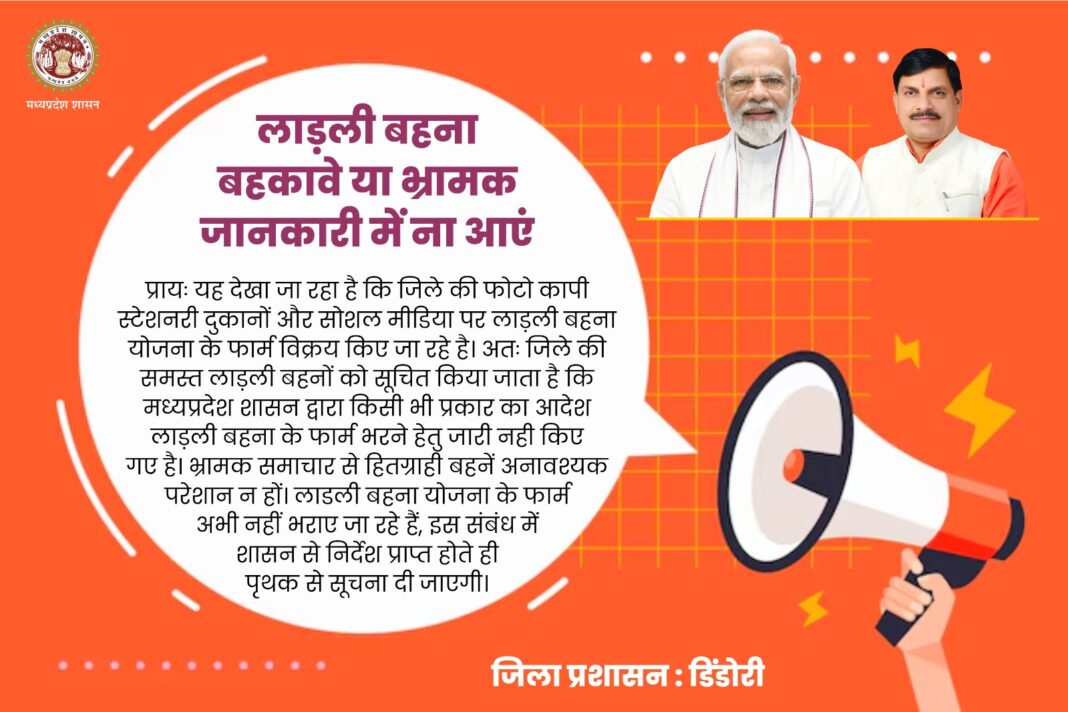सेवाजोहार (डिंडौरी):- प्रायः यह देखा जा रहा है कि जिले की फोटो कापी एवं स्टेश्नरी दुकानों पर लाड़ली बहना योजना के फार्म विक्रय किये जा रहे है। अतः जिले की समस्त लाड़ली बहनों को सूचित किया जाता है कि मध्यप्रदेश शासन द्वारा किसी भी प्रकार का आदेश लाड़ली बहना के फार्म भरने हेतु जारी नही किये गये है। भ्रामक समाचार से हितग्राही बहनें अनावश्यक परेशान न हों। लाड़ली बहना योजना के फार्म अभी नहीं भराये जा रहे हैं, इस संबंध में शासन से निर्देश प्राप्त होते ही पृथक से सूचना दी जाएगी।