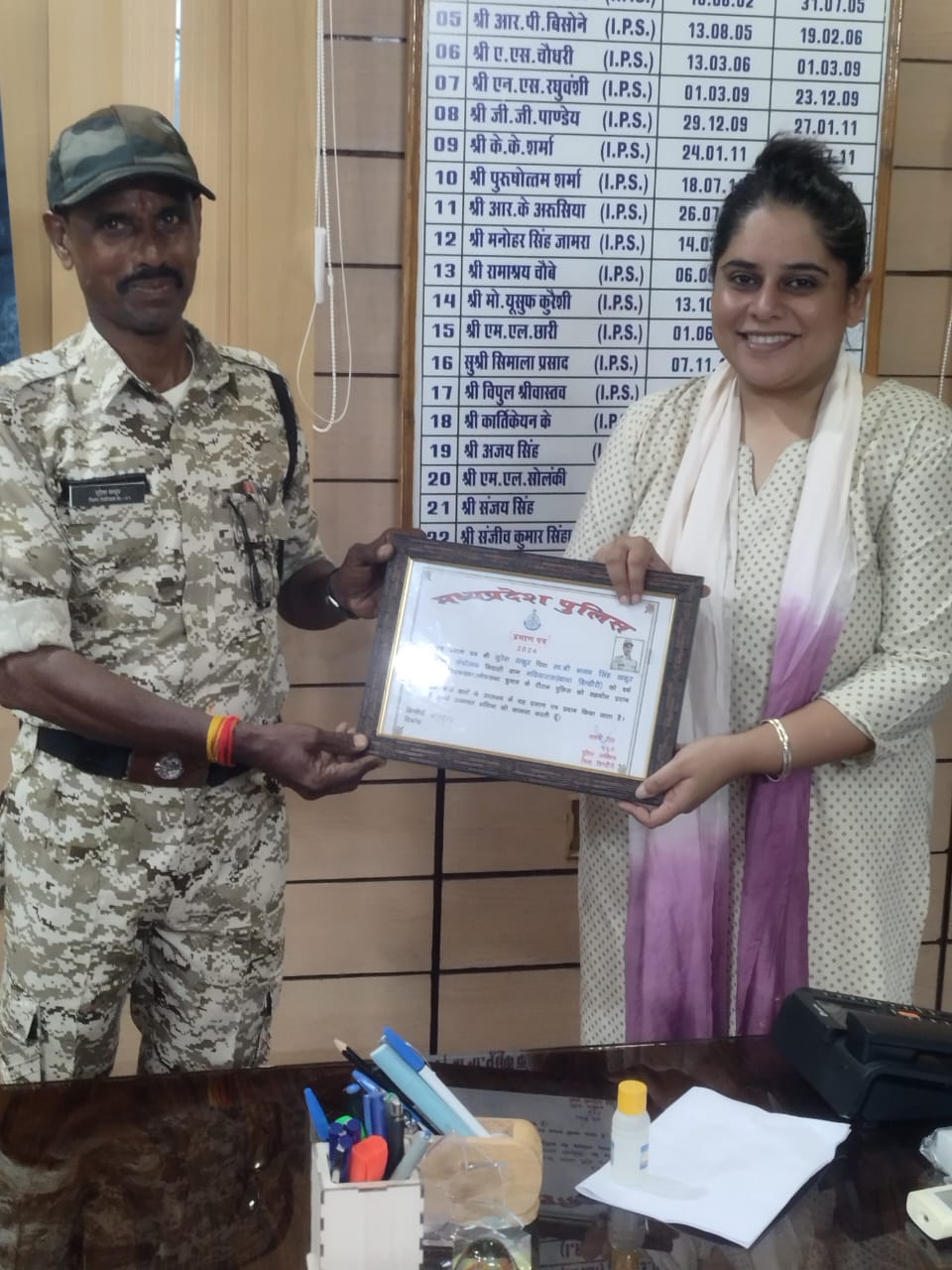 सेवाजोहार (डिंडोरी):- डिंडोरी जिले की पुलिस अधीक्षक वाहिनी सिंह ने सोमवार को ग्राम रक्षा समिति के जिला संयोजक सुरेश ठाकुर निवासी मढियारास को प्रशस्ति पत्र देकर सम्मानित किया है।