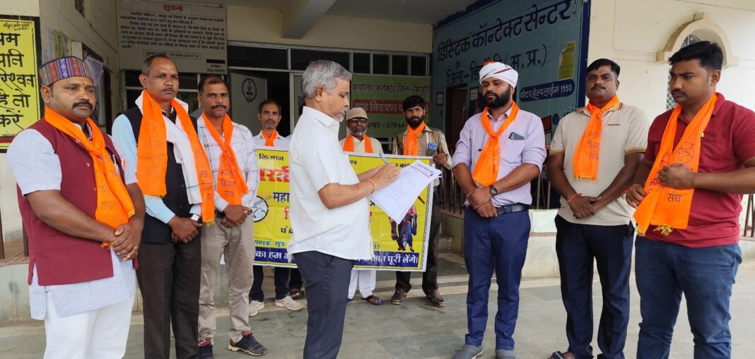 सेवाजोहार (डिंडोरी):- भारतीय किसान संघ के द्वारा अपनी विभिन्न मांगो को लेकर प्रदेश के मुख्यमंत्री के नाम जिला के अपर कलेक्टर सरोधन सिंह को ज्ञापन सौपा है।