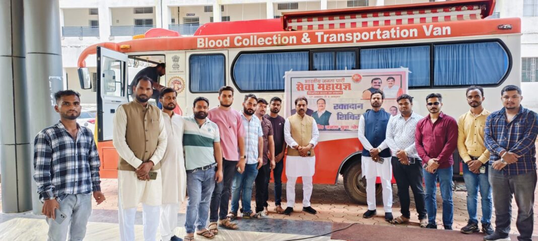 सेवाजोहार (डिंडोरी):- भारतीय जनता पार्टी के प्रदेशाध्यक्ष विष्णुदत्त शर्मा, प्रदेश संगठन महामंत्री हितानंद शर्मा युवामोर्चा प्रदेशाध्यक्ष वैभव पवार के निर्देशानुसार, युवामोर्चा प्रभारी व प्रदेश महामंत्री कविता पाटीदार, जिला संगठन प्रभारी गिरीश द्विवेदी, भाजपा जिलाध्यक्ष अवध राज बिलैया के मार्गदर्शन में व युवामोर्चा जिलाध्यक्ष राकेश सिंह परस्ते के नेतृत्व में विश्व के सबसे लोकप्रिय नेता एवं देश के यशस्वी प्रधानमंत्री नरेन्द्र मोदी के 17 सितम्बर जन्मदिन को भारतीय जनता युवामोर्चा के द्वारा सेवा पखवाड़ा के रूप में मना रही है। इसकी तारतम्य में मेकलसुता महाविद्यालय डिण्डौरी में विशाल रक्तदान शिविर का आयोजन किया गया, जिसमें बड़ी संख्या में युवामोर्चा के पदाधिकारियों, कार्यकर्ताओं व महाविद्यालय के विद्यार्थियों ने राष्ट्रहित में कार्य कर रहे प्रधानमंत्री नरेन्द्र मोदी की दीर्घ आयु के लिए रक्तदान शिविर में बढ़ चढ़ कर हिस्सा लिया एवं मोदी की स्वास्थ्य एवं दीर्घायु की कामना की।