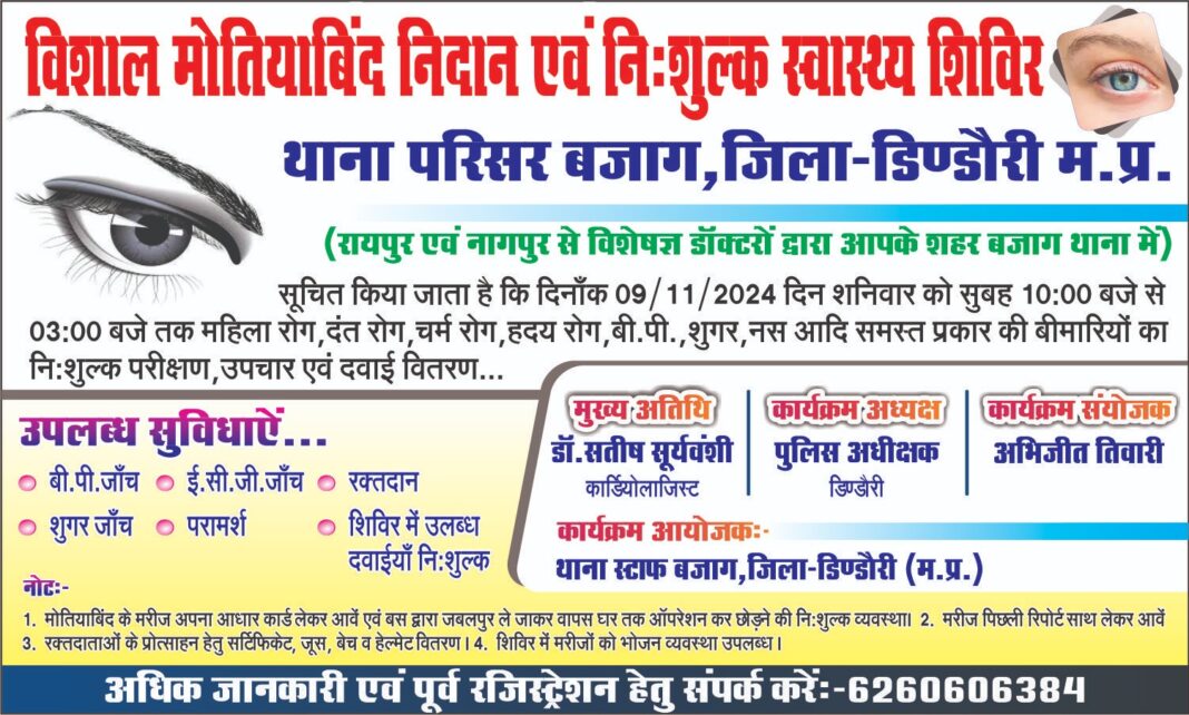 देव जी नेत्रालय जबलपुर के द्वारा मोतियाबिंद से पीड़ित मरीजों के लिए निशुल्क बस की व्यवस्था की गई है जिसमें मरीज अपनी निशुल्क मोतियाबिंद का ऑपरेशन जबलपुर में बस के द्वारा जाकर एवं निशुल्क बस में वापस घर में छोड़ने की व्यवस्था की गई है। बैगा बहुलय क्षेत्र में स्वास्थ्य सुविधाओं को बेहतर बनाने के उद्देश्य से इस प्रकार के शिविर का आयोजन किया जा रहा है। जिसमें दवाइयां का निशुल्क वितरण किया जाना है साथ में रक्तदान से संबंधित जो लोग रक्तदाता हैं वह उन्हें निशुल्क प्रमाण पत्र सर्टिफिकेट, जूस,एवं हेलमेट का वितरण थाने प्रांगण में किया जाएगा। साथ ही साथ आने वाले प्रत्येक मरीज के लिए भोजन की व्यवस्था की गई है ,आमजन से अपील है कि इस शिविर में उपस्थित होकर स्वास्थ शिविर का लाभ उठाएं जिसमें महिला रोग, दंत रोग, हृदय रोग, बीपी ,शुगर एवं शिशु रोग से संबंधित सभी प्रकार की जांचों एवं दवाइयां का वितरण निशुल्क किया जाएगा।