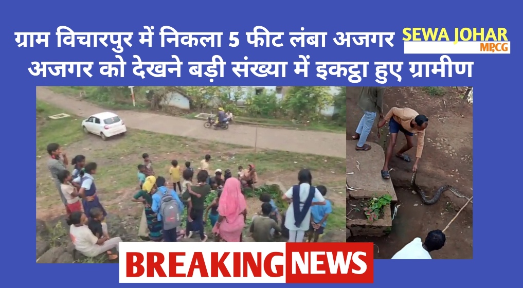 सेवाजोहार (डिंडोरी):- जिला मुख्यालय से लगी ग्राम पंचायत देवरा के नजदीक गांव विचारपुर में उस समय अफरा-तफरी का माहौल बन गया, जब गांव में बड़े अजगर दिखने की सूचना ग्रामीणों को मिली। देखते ही देखते ग्रामीणों का बड़ी संख्या में हुजूम बस्ती में निकल पड़ा।