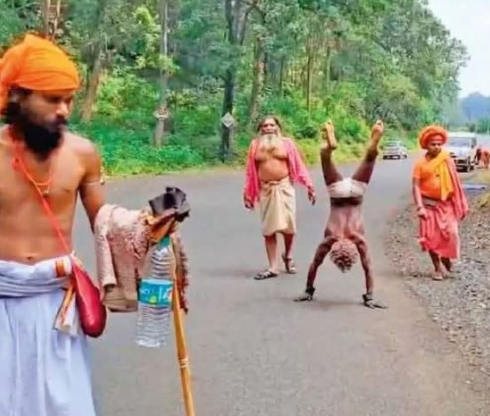 – चलने का तरीका: महाराज उल्टे होकर हाथों के बल पर चल रहे हैं।