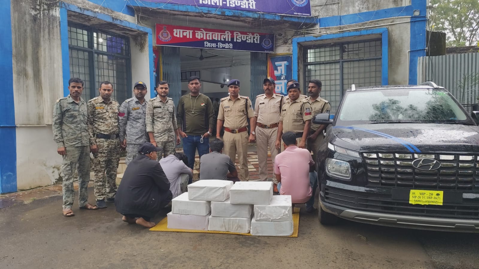 पुलिस से मिली जानकारी के अनुसार दिनांक 29-30/10/2025 की दरम्यानी रात कोतवाली पुलिस द्वारा मुखबिर सूचना के आधार पर कार्यवाही करते हुये एमपीटी डिंडोरी के सामने से बडा सुबखार जाने वाली कच्ची रोड पर अवैध शराब विक्रय के उददेश्य से घूम रहे एक बिना नंबरी काले रंग की हुंडई वेन्यू कार में बैठे चार लोग जिनमें राहुल साहू पिता राजेन्द्र साहू उम्र 32 साल निवासी शाहपुर, चन्द्र प्रकाश ठाकुर पिता तोडर सिंह ठाकुर उम्र 20 साल निवासी ग्राम बालपुर रैयत थाना शाहपुर, रामनाथ बंजारा पिता स्व. पुहप सिंह बंजारा उम्र 29 साल निवासी ग्राम बालपुर रैयत थाना शाहपुर एवं लोक सिंह परस्ते पिता स्व. बिहारी लाल परस्ते उम्र 28 साल निवासी ग्राम बालपुर रैयत थाना शाहपुर जिला डिंडौरी के कब्जे से कुल अंग्रेजी शराब 366 पाव (65ली. 880ML) कीमती करीब 54358 रूपये एवं एक बिना नम्बर हुंडई वैन्यू कार कीमती करीब 11 लाख रूपये, आरोपी राहुल साहू के पास से एक वन प्लस कम्पनी का मोबाईल कीमती करीब 25000 रूपये एवं नगदी 1080 रूपये, आरोपी रामनाथ बंजारा के पास से एक पोको कम्पनी का मोबाईल कीमती करीब 10000 रूपये एवं नगदी 800 रूपये, यूनियन बैंक का कस्टमर आईडी कार्ड, आरोपी चन्द्रप्रकाश ठाकुर के पास से एक रियलमी कंपनी का मोबाईल कीमती करीब 10000 रूपये कुल मशरूका 1201238 रूपये (बारह लाख एक हजार दो सौ अडतिस रूपये) का जप्त किया है।