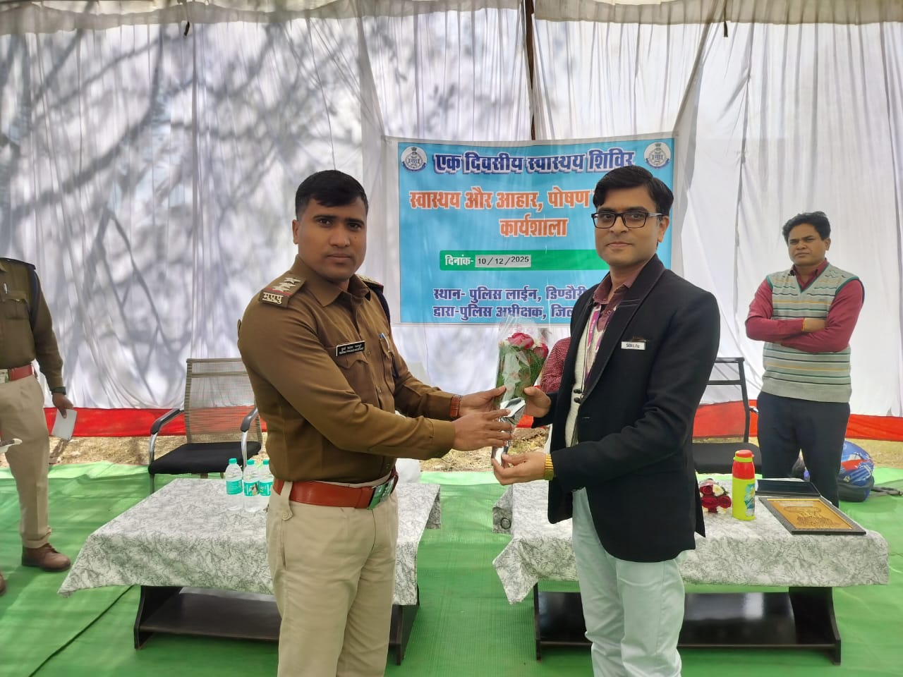 सेवाजोहार (डिंडोरी):- पुलिस अधीक्षक डिंडौरी वाहनी सिंह के निर्देशन में बुधवार को पुलिस लाइन परिसर डिंडौरी में एक दिवसीय स्वास्थ्य शिविर एवं आहार-पोषण संबंधी कार्यशाला का सफलतापूर्वक आयोजन किया गया। कार्यक्रम में मुख्य अतिथि के रूप में डॉ. विजय झारे, सहायतार्थ डॉ. खुशबू गुलवानी, जिला आयुष विभाग डिंडौरी, तथा स्टेट बैंक ऑफ इंडिया लाइफ इंसोरेंस के मैनेजर रोहित जैन उपस्थित रहे।