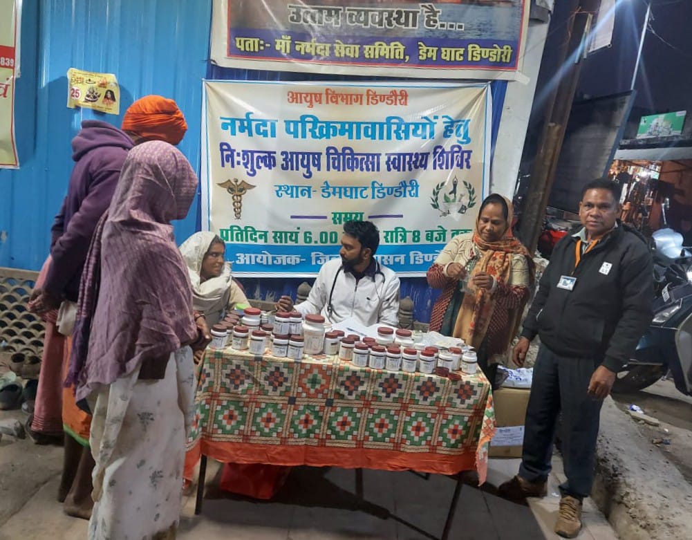 सेवाजोहार (डिंडोरी):- कलेक्टर अंजू पवन भदौरिया के निर्देशानुसार आयुष विभाग द्वारा नर्मदा परिक्रमावासियों के स्वास्थ्य संरक्षण हेतु निःशुल्क आयुष चिकित्सा स्वास्थ्य शिविर का आयोजन निरंतर किया जा रहा है। यह शिविर मां नर्मदा नदी डेमघाट, डिंडौरी में प्रतिदिन सायं 6.00 बजे से रात्रि 8.00 बजे तक संचालित किया जा रहा है।