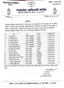 सेवाजोहार (डेस्क):- मध्यप्रदेश आदिवासी कांग्रेस विभाग में कांग्रेस संगठन को मजबूत करने के लिए डॉ. विक्रांत भूरिया राष्ट्रीय अध्यक्ष आल इंडिया आदिवासी कांग्रेस की स्वीकृति एवं हरीश चौधरी प्रभारी म.प्र.काग्रेस कमेटी, जीतू पटवारी अध्यक्ष म.प्र. कांग्रेस कमेटी की सहमति से मध्यप्रदेश आदिवासी कांग्रेस में प्रदेश स्तर पर निम्नानुसार नियुक्तियां की जाती है:-