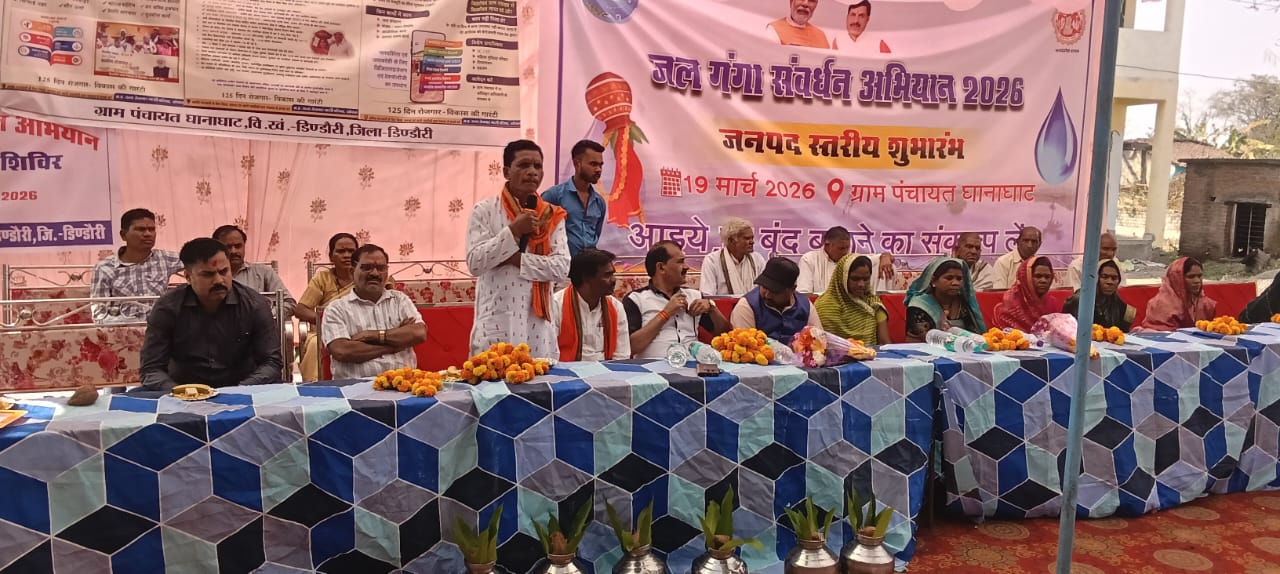 सेवाजोहार (डिंडोरी):- जल संरक्षण को जनआंदोलन बनाने की दिशा में ग्राम पंचायत घानाघाट में 19 मार्च 2026 को “जल गंगा संवर्धन” अभियान के अंतर्गत जिला स्तरीय शिविर एवं जियो-टैगिंग प्रशिक्षण कार्यक्रम का सफल आयोजन किया गया। इस अवसर पर जनपद पंचायत डिंडौरी के लगभग 70 ग्राम पंचायतों से सरपंच, सचिव, रोजगार सहायक एवं बड़ी संख्या में ग्रामीणजन उपस्थित रहे।
