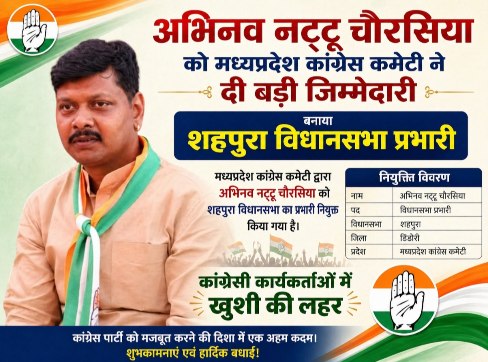 सेवाजोहार (डिंडोरी): मध्यप्रदेश कांग्रेस कमेटी ने संगठन को मजबूत करने की दिशा में एक अहम निर्णय लेते हुए युवा नेता अभिनव चौरसिया (नट्टू) को डिंडोरी जिले की शहपुरा विधानसभा का प्रभारी नियुक्त किया है। इस नियुक्ति के बाद क्षेत्रीय कांग्रेस कार्यकर्ताओं, विशेषकर युवाओं में खासा उत्साह देखने को मिल रहा है।
