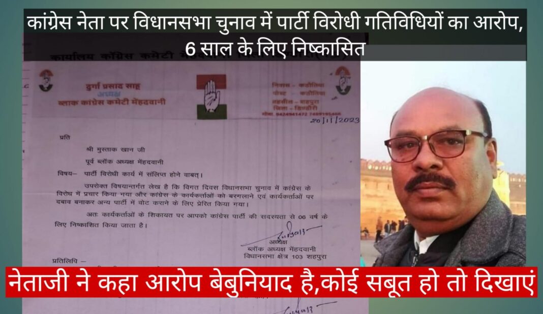 डिंडोरी : हाल ही में 17 नवंबर को विधानसभा चुनाव संपन्न हुए ,जिसके नतीजे 3 दिसंबर को आने को है,लेकिन चुनाव परिणाम आते उससे पहले ब्लॉक अध्यक्ष मेहदवानी दुर्गा प्रसाद साहू द्वारा विगत दिवस मेहदवानी कांग्रेस के पूर्व ब्लॉक अध्यक्ष मुस्ताक खान को पार्टी विरोधी गतिविधियों में शामिल होने के चलते कांग्रेस कार्यकर्ताओं की शिकायत पर कांग्रेस पार्टी की सदस्यता से छः वर्ष तक के लिए निष्काशित कर दिया गया है और दुर्गा प्रसाद साहू ने बाकायदा अपने लेटर पैड में इस बात का उल्लेख किया है। उक्त पत्र में कांग्रेस ब्लॉक अध्यक्ष दुर्गा प्रसाद साहू ने इस बात का जिक्र भी किया है कि मुस्ताक खान पूर्व ब्लॉक अध्यक्ष के द्वारा विधान सभा चुनाव में कांग्रेस के विरोध में प्रचार – प्रसार किया गया एवं कांग्रेस कार्यकर्ताओं को बरगलाते हुए दबाव बनाकर अन्य राजनीतिक दल के पक्ष में वोट डालने प्रेरित किया गया।