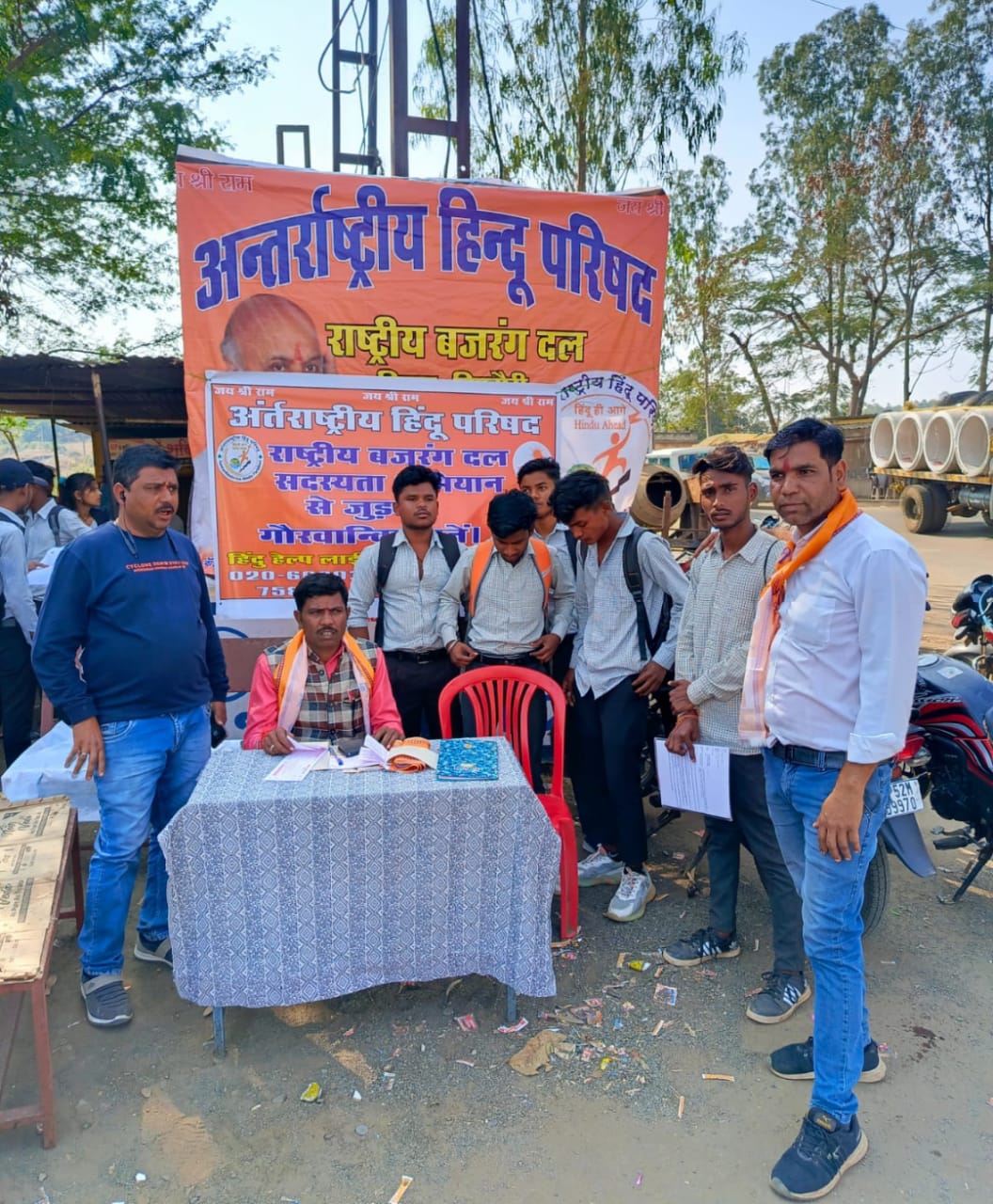 डिंडोरी : सोमवार के दिन अंतर्राष्ट्रीय हिंदू परिषद राष्ट्रीय बजरंग दल डिंडोरी द्वारा राष्ट्रीय अध्यक्ष प्रवीण भाई तोगड़िया के मार्गदर्शन में भारत देश में में 10 लाख हिंदुओं को महा अभियान में जोड़ने का कार्य चल रहा है, जिसे ध्यान में रखते हुए शासकीय चंद्र विजय कॉलेज डिंडोरी के मुख्य द्वार के सामने स्टॉल लगाकर राष्ट्रीय हिंदू परिषद राष्ट्रीय बजरंग दल का सदस्यता अभियान चलाया गया, जिसमें सैकड़ो हिंदू भाइयों ने संगठन से जुड़ने की सदस्यता ग्रहण की।