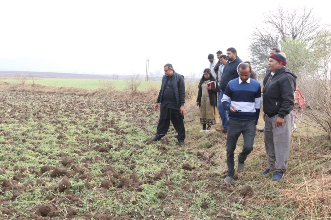 सेवाजोहार (डिंडोरी):- रविवार को कलेक्टर विकास मिश्रा ने जिले में हुई ओलावृष्टि के नुकसान का निरीक्षण ग्राम पंचायत कसई सोडा विक्रमपुर के पास किया। पटवारी हल्का नंबर 12 आर ए बाल सिंह बालको पटवारी दीपक साहू राजेश परस्ते तहसीलदार सुशांत संडे जी उपस्थित रहे। कलेक्टर ने खेतों में जा जाकर निरीक्षण तिलहन दलहन फसलों को दिखा मटर अलसी बताता बटरी मसूरी गेहूं की फसल में नुकसान हुआ है। जिसे कलेक्टर के निर्देशन में पटवारी , आर आई तहसीलदार टीम के साथ सर्वे कर रही है। 9 ग्राम पंचायत में अधिक नुकसान देखने को मिला है।